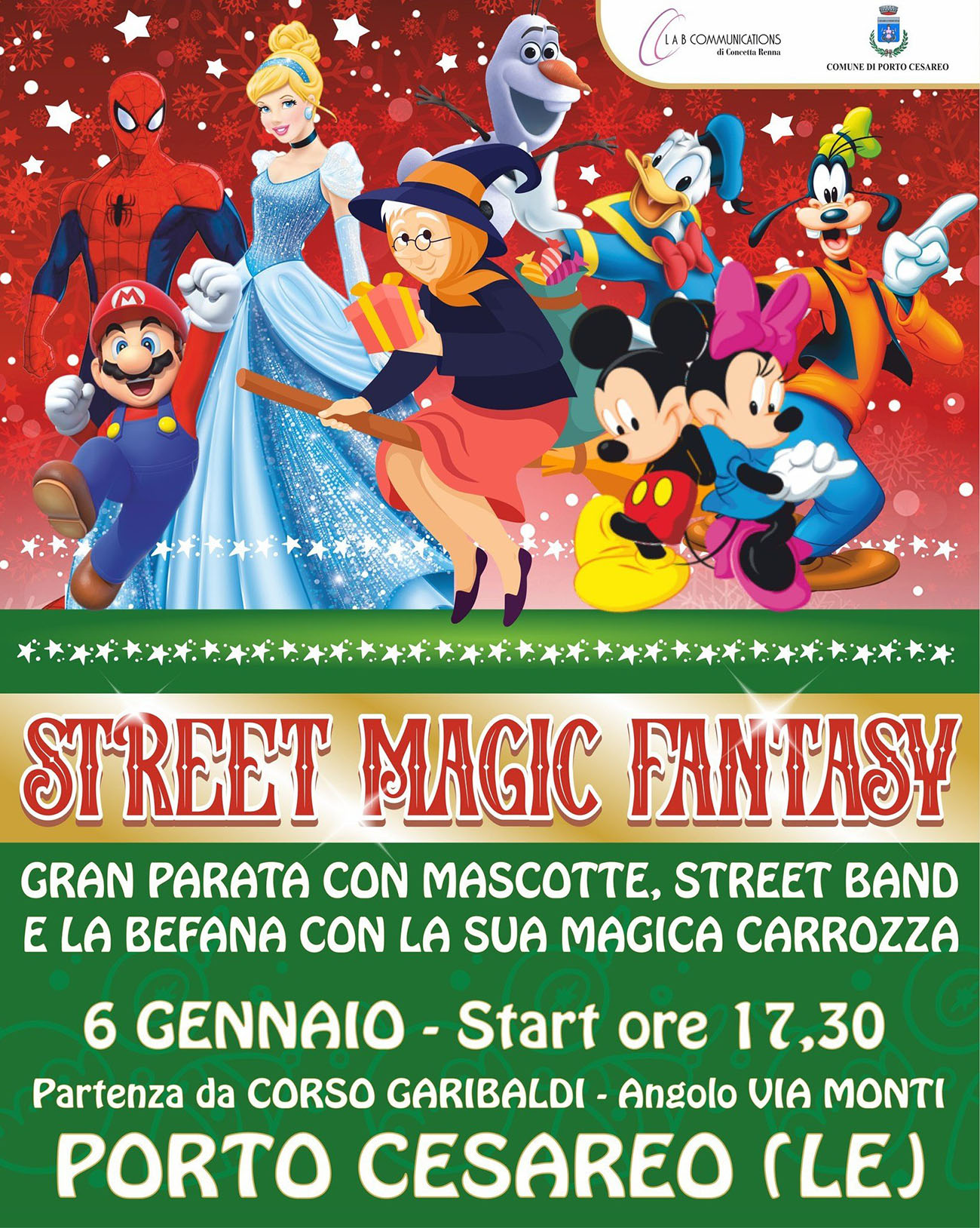 Street Magic Fantasy – Gran Parata della Befana 6 gennaio – start ore 17:30 Porto Cesareo Martedì 6 gennaio la Befana arriverà a Porto Cesareo con una scintillante carrozza trainata…